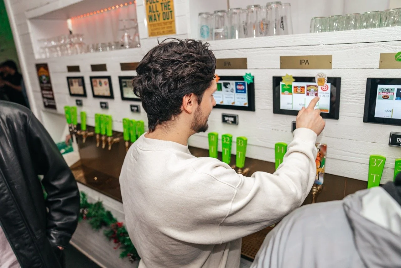 A guy selecting what beverage he wants to drink at the tap wall. He's in a white sweatshirt and tapping the screen above the taps.